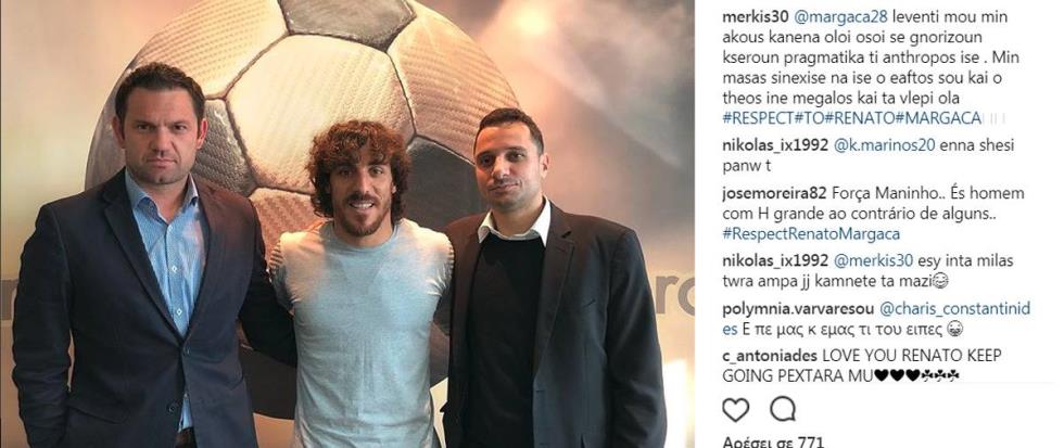 Στο πλευρό του Ρενάτο Μαργκάσα τάχθηκε ο Γιώργος Μερκής. Ο ποδοσφαιριστής του ΑΠΟΕΛ απάντησε στην ανάρτηση του αρχηγού της Ομόνοιας με αφορμή τη φημολογία που ξέσπασε μετά την απόφαση του Ιβάιλο Πέτεφ να θέσει εκτός ομάδας τόσο τον πολιτογραφημένο Κύπριο ποδοσφαιριστή της Ομόνοιας, όσο και τους Άλεξ Σοάρες και Ράφα Λόπες.