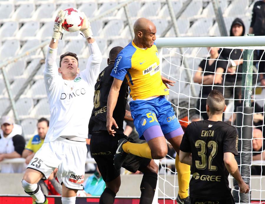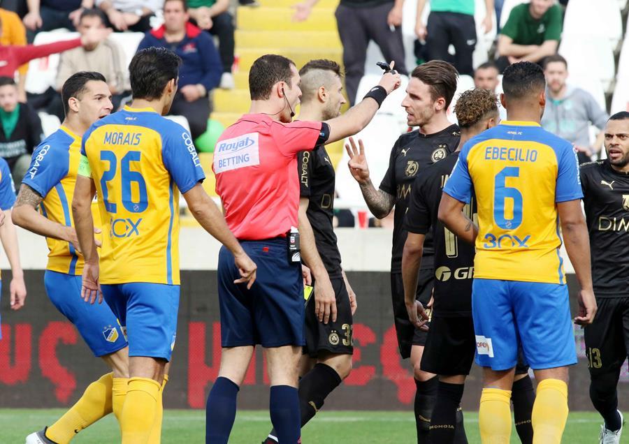 Η κραυγαλέα ευκαιρία του ημιχρόνου ωστόσο, άνηκε στον Μίκαελ Ποτέ του οποίου η κεφαλιά στο 41’ σταμάτησε στο οριζόντιο δοκάρι του Χριστοδούλου. Πέναλτι ζήτησε ο ΑΠΟΕΛ ένα λεπτό αργότερα σε μαρκάρισμα του Βύντρα στον Σάλαι, με την επαναληπτική προβολή να δείχνει ότι υπήρξε επαφή μεταξύ των δυο παικτών.