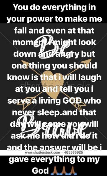 "Κάνετε ότι μπορείτε για να με κάνετε να λυγίσω και εκείνη τη στιγμή μπορεί να φαίνεται πως είμαι κάτω και θυμωμένος αλλά ένα πράγμα που πρέπει να ξέρετε είναι ότι θα γελάσω μαζί σας και θα σας πω ότι υπηρετώ έναν ζωντανό ΘΕΟ που ποτέ δεν κοιμάται. Και θα έρθει εκείνη η μέρα που θα με ρωτήσετε πως τα κατάφερα και η απάντηση θα είναι ότι τα έδωσα όλα στον Θεό μου"