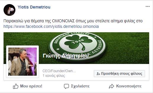 Συνέχεια στην προσπάθεια του για να αναλάβει τα ηνία της προεδρίας της Ομόνοιας δίνει ο γνωστός επιχειρηματίας που απασχόλησε το τελευταίο διάστημα με τις ανακοινώσεις του, Γιώτης Δημητρίου, μέσω του προσωπικού του λογαριασμού.