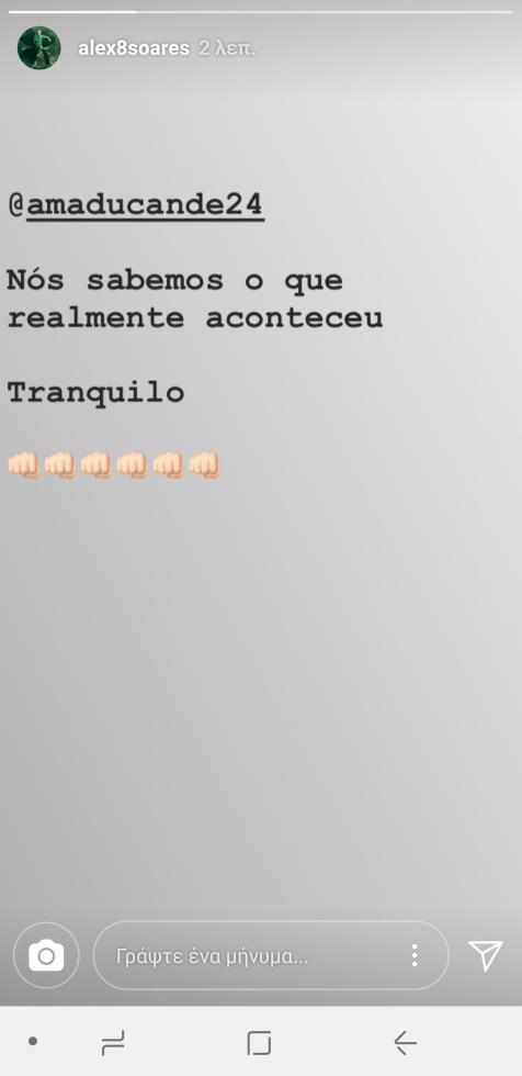 Περισσότερο νερό στο μύλο αναφορικά με το γιατί δημιουργήθηκε σκηνικό μεταξύ των δύο συμπαικτών έριξε ο Άλεξ Σοάρες, ο οποίος πριν λίγο ανήρτησε στο λογαριασμό του στο Instagram ένα μήνυμα με παραλήπτη τον Μαμαντου Καντέ.