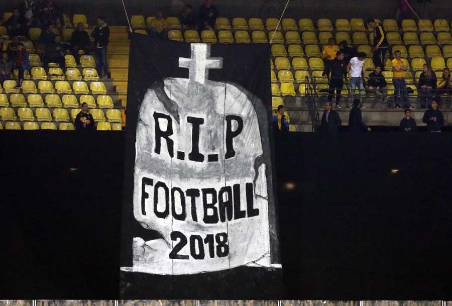 Μαύρο πανί με σταυρό και την επιγραφή «R.I.P Football 2018» τοποθέτησαν στην Ανατολική κερκίδα του Τσιρείου οι οργανωμένοι οπαδοί της ΑΕΛ.