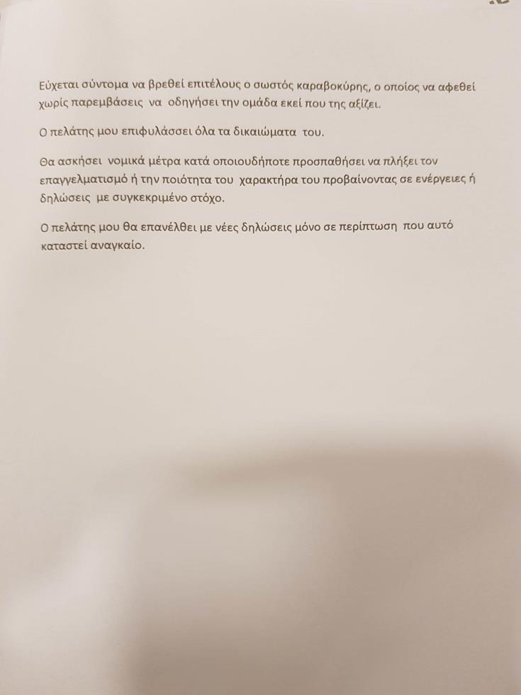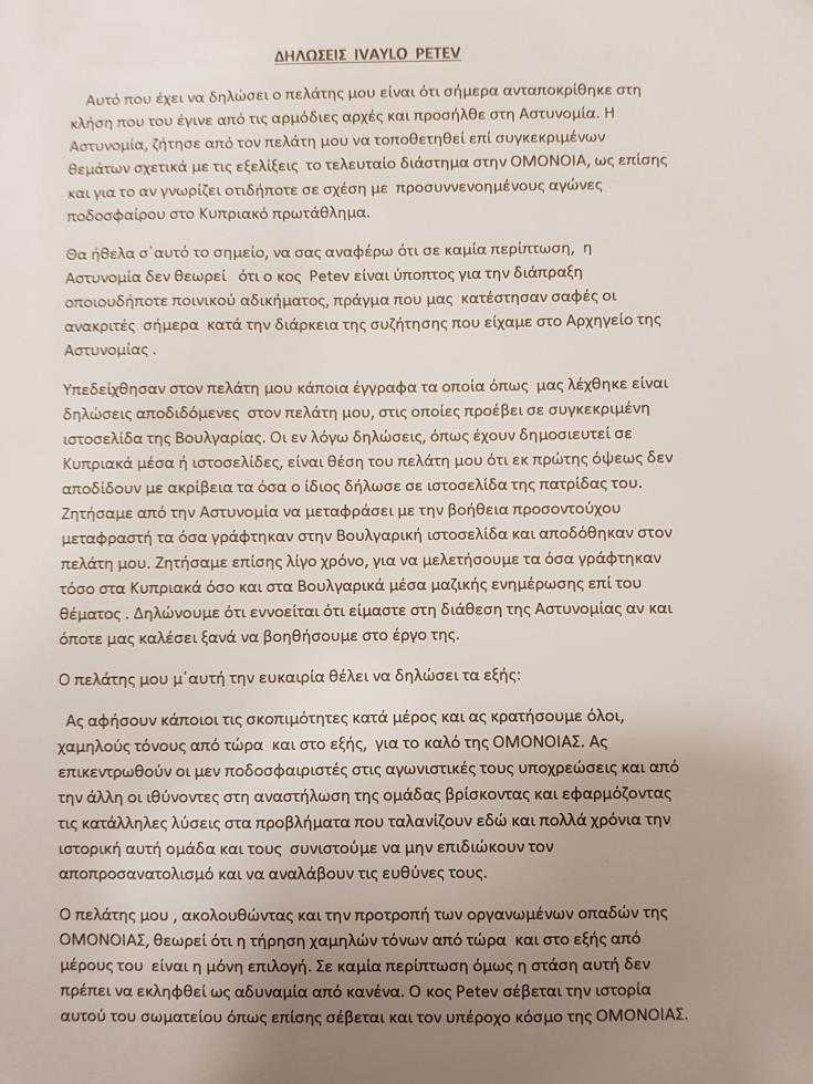 Υπεδείχθησαν στον πελάτη μου κάποια έγγραφα τα οποία όπως μας λέχθηκε είναι δηλώσεις που αποδόθηκαν στον πελάτη μου σε ιστοσελίδα της Βουλγαρίας. Οι εν λόγο δηλώσεις όπως έχουν δημοσιευτεί στα κυπριακά ΜΜΕ είναι θέση του πελάτη μου ότι εκ πρώτης δεν αποδίδουν τα όσα ο ίδιος δήλώσε σε ιστοσελίδα της πατρίδας του. Ζητήσαμε από την Αστυνομία να μεταφράσει τα όσα γράφτηκαν στην Βουλγαρική ιστοσελίδα και αποδόθηκαν στον πελάτη μου.