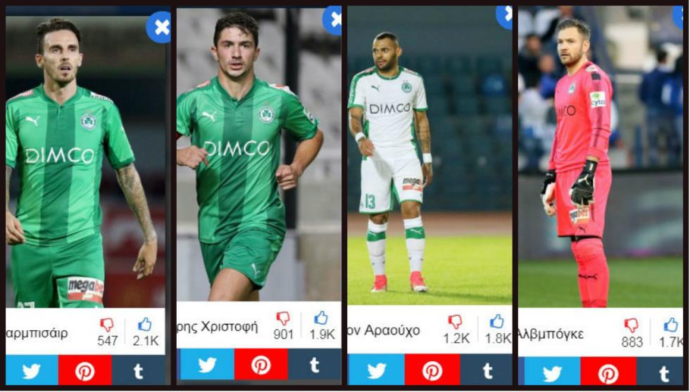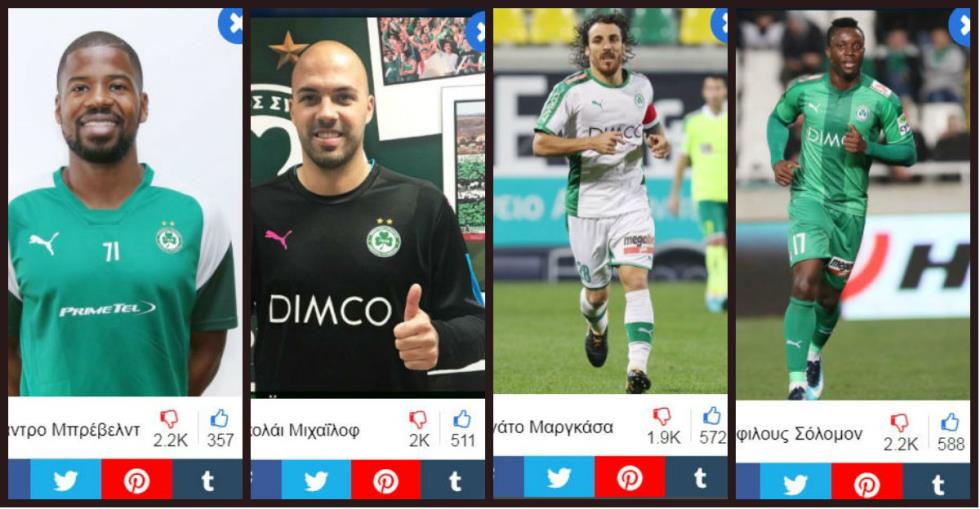 Πρώτος στη λίστα των «αγαπημένων» είναι ο Ματ Νταρμπισάιρ. Ο Άγγλος επιθετικός καταφέρνει να διαπρέπει παρά τον κατήφορο της Ομόνοιας. Θετικό ψήφο κέρδισαν, επίσης, οι Δημήτρης Χριστοφή και Τζαΐλσον Αραούχο. Στην τέταρτη θέση είναι ο Τζον Αλβμπόγκε. Ο Σουηδός τερματοφύλακας κέρδισε τους φίλους των πρασίνων, παρά το γεγονός ότι τραυματίστηκε στο πρώτο του παιχνίδι και εκ τότε είναι παροπλισμένος.