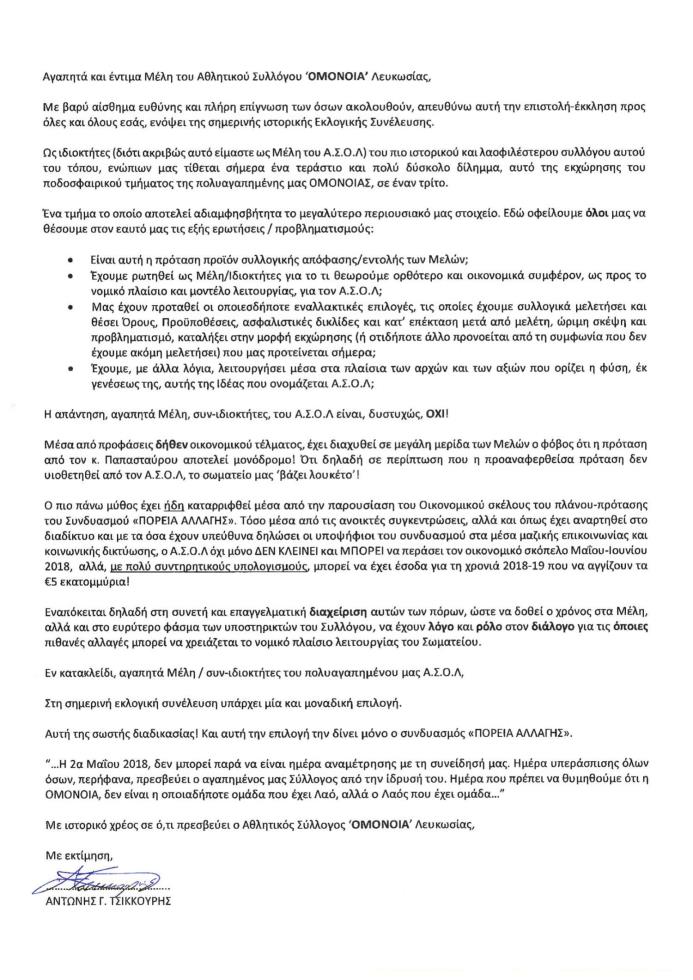 Μέσω επιστολής το μέλος του συνδυασμού «Πορεία Αλλαγής», Αντώνης Τσικκουρής, στέλνει το δικό του μήνυμα ενόψει της Έκτακτης Εκλογικής Συνέλευσης της Ομόνοιας, για να επισημάνει ότι με την απόρριψη της πρότασης Παπασταύρου, η Ομόνοια δεν βάζει λουκέτο.