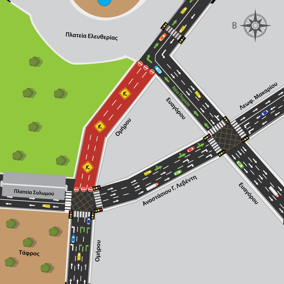 • Η αριστερή λωρίδα παραμένει ως έχει, με υποχρεωτική πορεία προς τα αριστερά (προς Πλατεία Σολωμού)