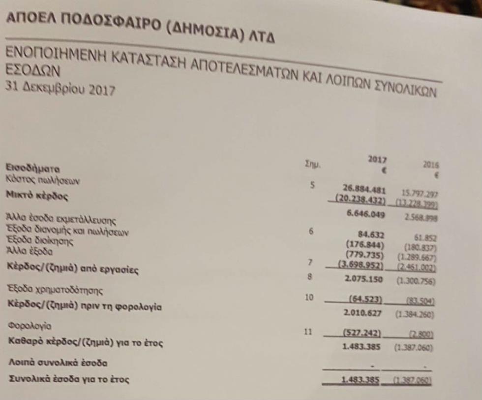 Στις οικονομικές καταστάσεις που δόθηκαν στα μέλη της Γενικής Συνέλευσης της εταιρείας ΑΠΟΕΛ φαίνεται το κέρδος.
