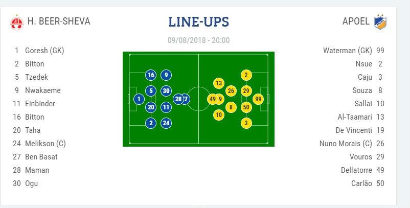 Στην αρχική ενδεκάδα ο προπονητής των γαλαζοκιτρίνων επέλεξε τους: H ενδεκάδα του ΑΠΟΕΛ: Βάτερμαν, Νσούε, Καζού, Σόουζα, Σάλαι, Τάμαρι, Ντε Βινσέντι, Μοράις, Βούρος, Ντελατόρε και Καρλάο