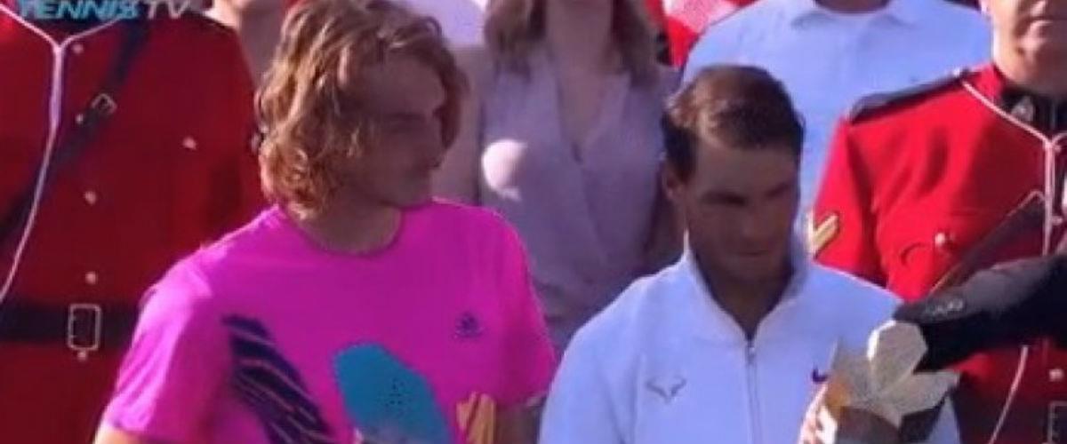 Ακόμη και οι καλύτεροι, έχουν τις δύσκολες στιγμές τους. Μια τέτοια ήταν για τον Ράφα Ναδάλ και τον Στέφανο Τσιτσιπά η απονομή των τροπαίων τους μετά τον τελικό του Rogers Cup στο Τορόντο, καθώς ουδείς εκ των δύο μπορούσε να καταλάβει ποια μεριά ήταν η σωστή! "Πώς το κρατάμε;" φάνηκε να λέει ο Έλληνας τενίστας στον Ισπανό θρύλο του αθλήματος, που είχε κι αυτός μπερδευτεί και έκανε μια χαρακτηριστική γκριμάτσα. Τελικά, ένας εκ των διοργανωτών έφτασε για να δώσει την λύση, έστω κι αν αυτή βρέθηκε με αρκετή δυσκολία.