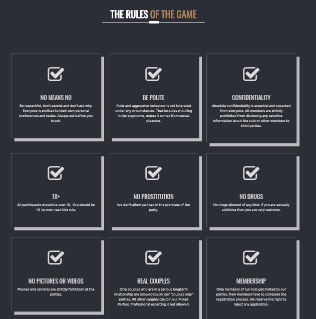 Όπως αναφέρεται στην ιστοσελίδα τα πάρτι απευθύνονται σε ανοιχτόμυαλα ζευγάρια και σε ελεύθερες γυναίκες. «Αν είσαι ένας περίεργος πρωτάρης που θέλει απλά να βλέπει ή ένας βετεράνος του είδους σίγουρα θα βρεις αυτό που θες στα πάρτι μας. Όταν ενταχθείς στο club θα συνειδητοποιήσεις ότι δεν περιτριγυρίζεσαι από μανιακούς του σεξ αλλά από καθημερινούς ανθρώπους που είναι λίγο πιο τολμηροί,» αναφέρει η σελίδα.