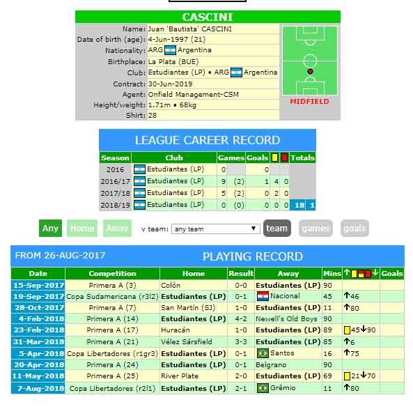 Ο Μπαουτίστα Καστίνι αγωνίζεται με τη φανέλα της Εστουδιάντες από το 2016, ενώ την περασμένη χρονιά κατέγραψε εφτά συμμετοχές στην πρώτη ομάδα.