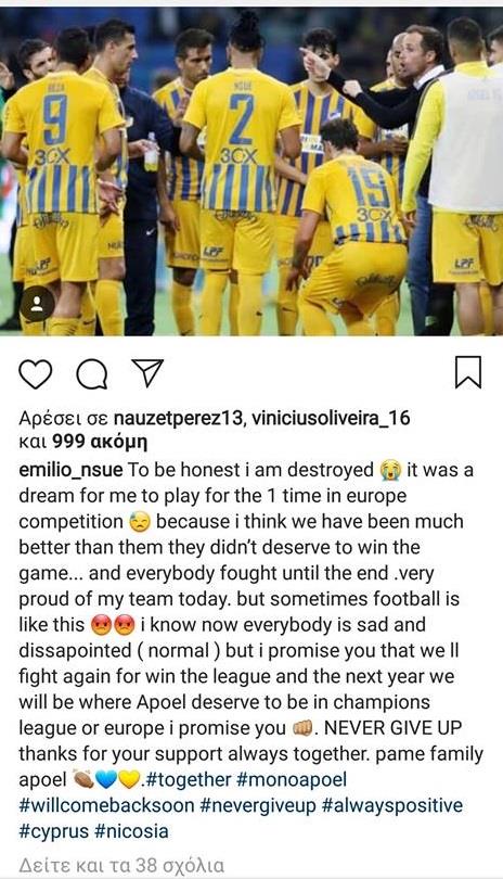 Την υπόσχεση πως το ΑΠΟΕΛ θα επιστρέψει πιο δυνατός και θα συμμετέχει σε ομίλους ευρωπαϊκής διοργάνωσης έδωσε ο ποδοσφαιριστής της ομάδας, Εμίλιο Ενσούε με ανάρτησή του στο Instagram, λίγο μετά τον αποκλεισμό από την Αστάνα.