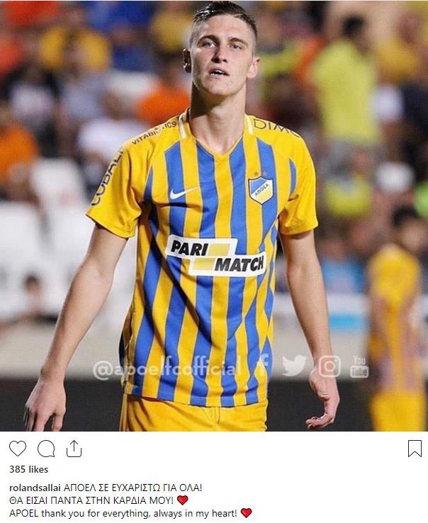 Το δικό του μήνυμα θέλησε να στείλει μέσω του προσωπικού του λογαριασμού, ο πρώην πλέον ποδοσφαιριστής του ΑΠΟΕΛ, Ρόλαντ Σάλαϊ, ο οποίος ευχαριστεί την ομάδα της Λευκωσίας για όλα όσα έζησε.