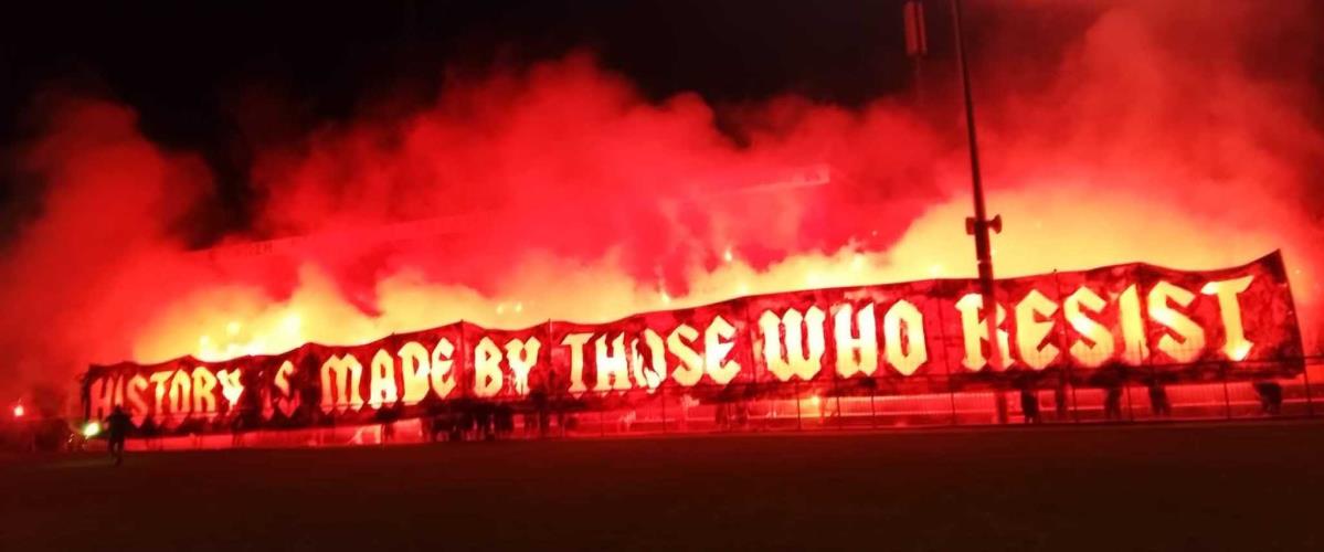 «Η ιστορία γράφεται από αυτούς που αντιστέκονται» ανέφερε το πανό που ανάρτησαν στην κερκίδα τους οι οπαδοί της Ομόνοιας 1948.
