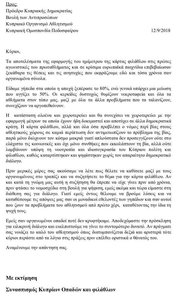 Επιστολή με την οποία εκφράζει την αντίθεσή της στην εφαρμογή της κάρτας φιλάθλου απέστειλε ο «Συνασπισμός Κυπρίων Οπαδών και φιλάθλων» στον Πρόεδρο της Δημοκρατίας, στην Βουλή, στον ΚΟΑ και στην ΚΟΠ.