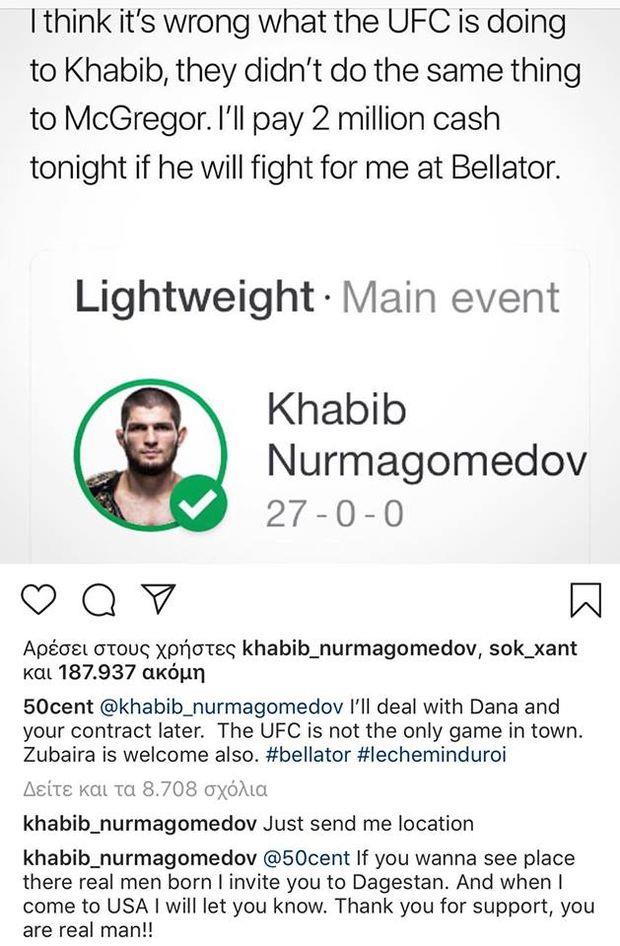 O γνωστός ράπερ, 50 Cent, μέσω Instagram έκανε πρόταση στον Khabib Nurmagomedov να παίξει για εκείνον στο Bellator έναντι 2.000.000 δολαρίων!
