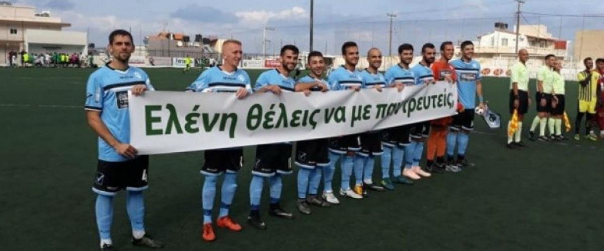 Οι δύο ομάδες βγήκαν στη σέντρα και εκείνη την στιγμή οι ποδοσφαιριστές των γηπεδούχων, κράτησαν ένα πανό στα χέρια το οποίο έγραφε: «Ελένη θέλεις να με παντρευτείς;», με τον Φραγκιαδάκη να ανεβαίνει στην εξέδρα και να ακούει το πολυπόθητο «ναι»!