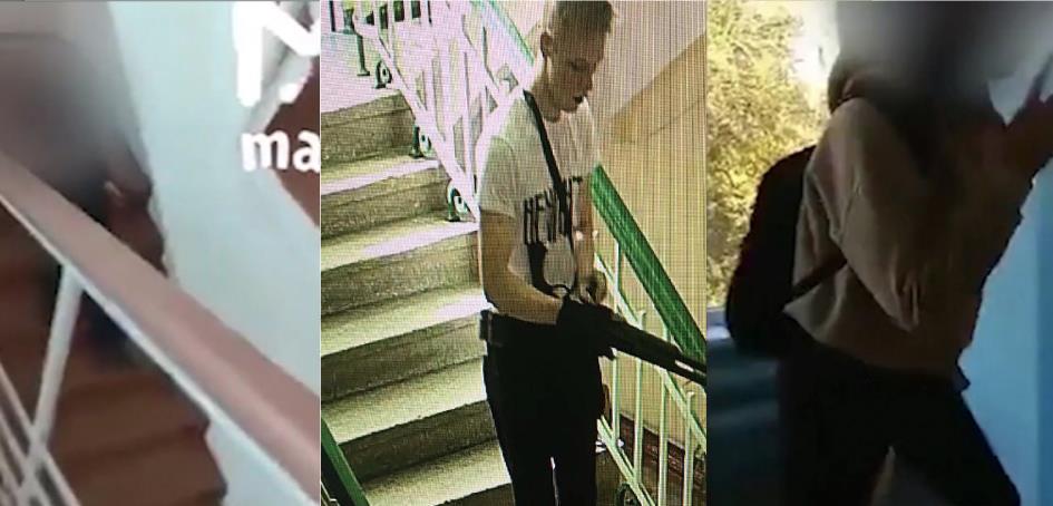 Στις εικόνες από τις κάμερες ασφαλείας που αναρτήθηκαν σε ιστοτόπους κοινωνικής δικτύωσης διακρίνεται ένας νεαρός με κοντά μαλλιά, που φοράει ένα λευκό μπλουζάκι και σκούρο παντελόνι, να κρατάει ένα τουφέκι και να ανεβαίνει μια σκάλα.