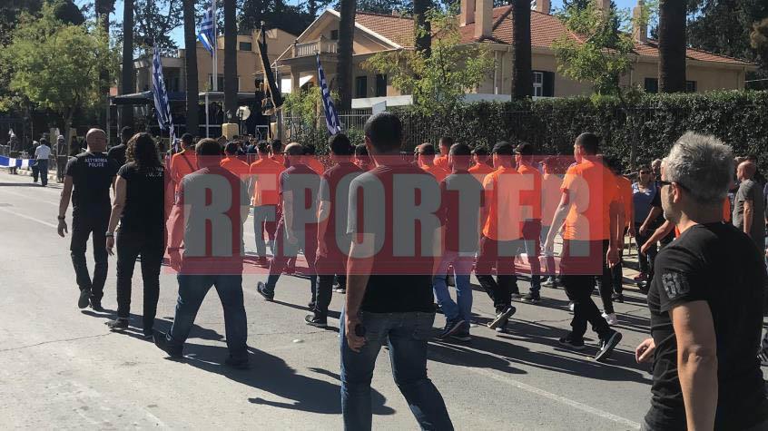 Οι οπαδοί των «γαλαζοκιτρίνων» που παρέλασαν με τη συνοδεία αστυνομικών, φώναξαν συνθήματα κατά της διζωνικής δικοινοτικής ομοσπονδίας και συγκεκριμένα, «αλήτες, προδότες, ομοσπονδιακοί, η Κύπρος είναι Ελληνική».