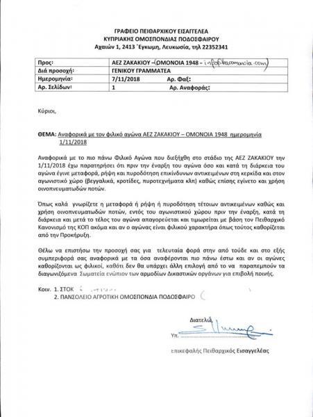 Στο θέμα των φωτοβολίδων αναφέρεται η Ομόνοια 1948 μέσα από ανακοίνωσή της, τονίζοντας πως είναι υπότροπη και ενδεχομένως να τιμωρηθεί στο πρώτο επίσημο παιχνίδι της εάν υπάρχουν οποιαδήποτε παραπτώματα.