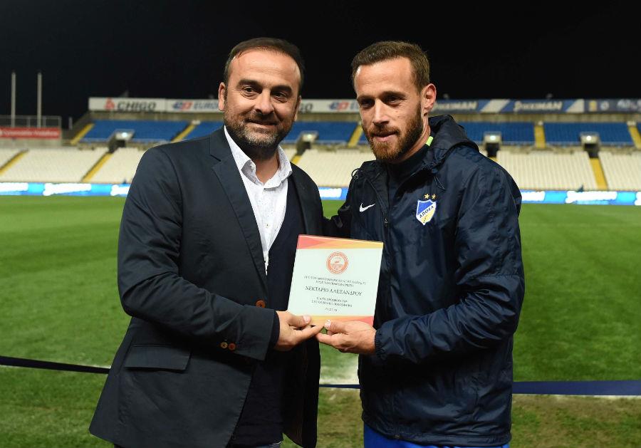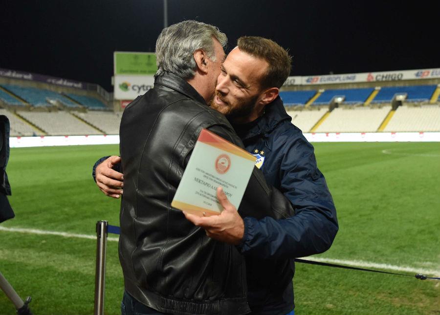 Τον Νεκτάριο Αλεξάνδρου βράβευσε πριν από την έναρξη της αναμέτρησης με τον ΑΠΟΕΛ ο πρόεδρος της Αγίας Νάπας, Κώστας Ηλία.