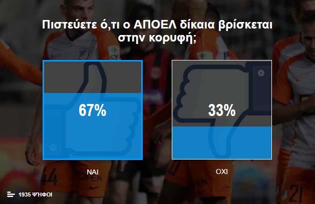 Η omada.com.cy έδωσε... πάσα στους αναγνώστες της και τους κάλεσε να ψηφίσουν κατά πόσο πιστεύουν ό,τι ο ΑΠΟΕΛ δίκαια βρίσκεται στην κορυφή της βαθμολογίας.