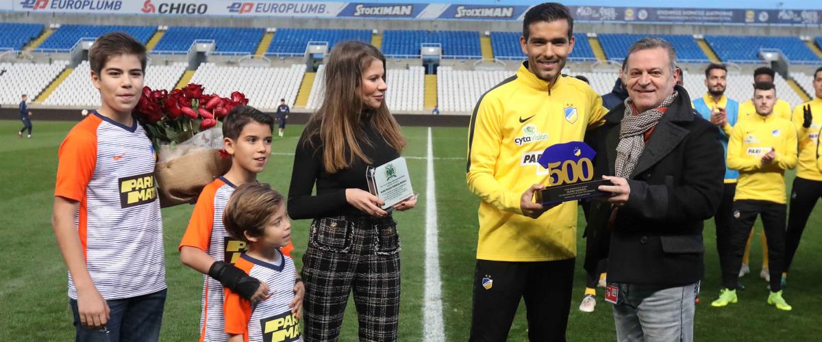 Τον Νούνο Μοράις για το τεράστιο επίτευγμά του να φθάσει τις 500 συμμετοχής με τη φανέλα του ΑΠΟΕΛ βράβευσε η ομάδα της Λευκωσίας πριν από την έναρξη του πρώτου αγώνα με την Δόξα.