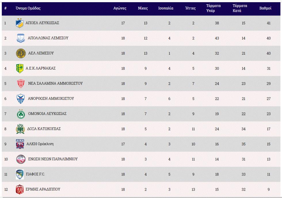 Με 41 βαθμούς, το ΑΠΟΕΛ βρίσκεται στην πρώτη θέση και θέλει νίκη για να διατηρήσει την απόσταση των τεσσάρων βαθμών από Απόλλωνα και ΑΕΛ που ακολουθούν.