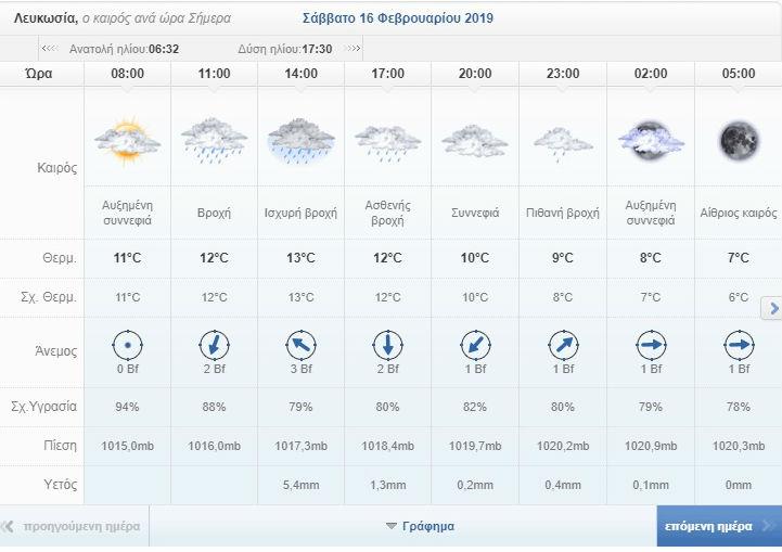 Βροχερός είναι ο καιρός που επικρατεί σήμερα (16/02) σε όλη την Κύπρο. Στη Λευκωσία, όπου το απόγευμα (17:00) στο ΓΣΠ ο ΑΠΟΕΛ φιλοξενεί την ΑΕΚ – στο πλαίσιο της 21ης αγωνιστικής του κυπριακού πρωταθλήματος.