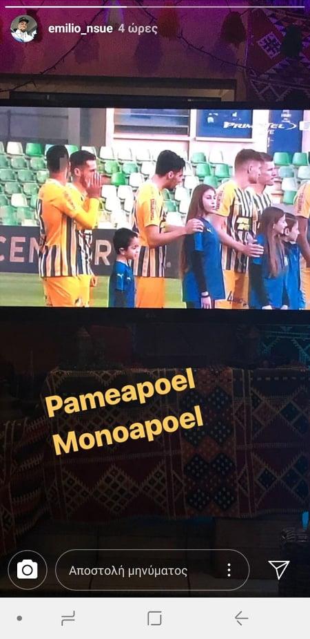Από την άλλη, καρφωμένος στην τηλεόρασή του ήταν και ο αμυντικός του ΑΠΟΕΛ, Εμίλιο Ενσούε πριν από το παιχνίδι με τον Απόλλωνα, εκφράζοντας μέσω του Instagram τη στήριξή του για την προσπάθεια των γαλαζοκιτρίνων, οι οποίοι κατάφεραν να φύγουν με ένα σπουδαίο διπλό από το Τσίρειο.