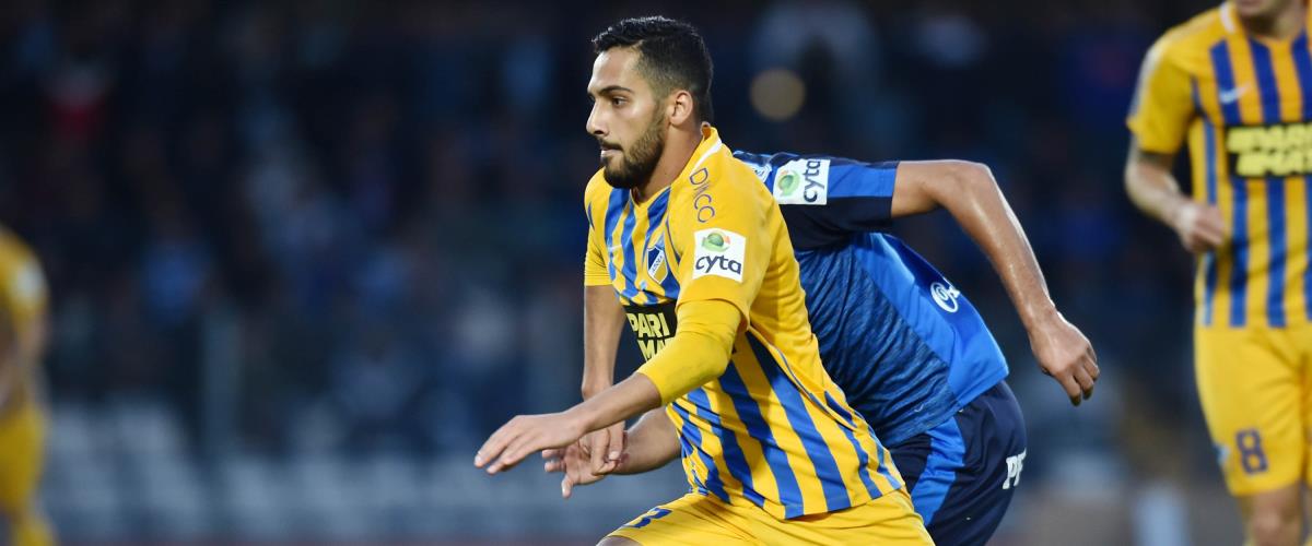 Ο μεσοεπιθετικός του ΑΠΟΕΛ, με μια εξαιρετική ντρίμπλα περνάει την μπάλα κάτω από τα πόδια του Σακέτι, ενώ στη συνέχεια καταφέρνει να κερδίσει φάουλ.