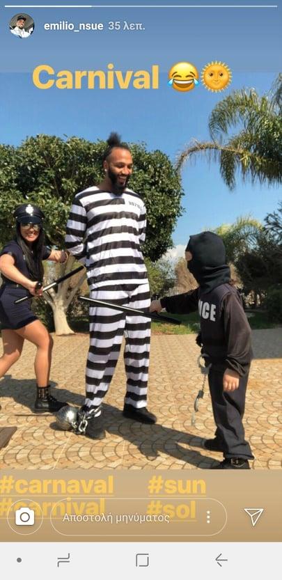 Ο ποδοσφαιριστής από την Ισημερινή Γουινέα, μετά την επίσκεψη στα χιόνια, ανέβασε στον προσωπικό του λογαριασμό στο Instagram μια φωτογραφία στην οποία είναι ντυμένος ως φυλακισμένος σε καρναβαλίστικο κλίμα μαζί με τη γυναίκα και τα παιδιά του να έχουν φορέσει την αμφίεση των αστυνομικών.