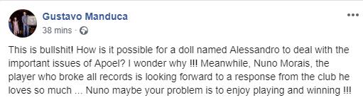 Με ανάρτησή του στον προσωπικό του λογαριασμό στο Facebook αναφέρεται στην ανανέωση του Νούνο Μοράις, έναν παίκτη που όπως σημειώνει έσπασε όλα τα ρεκόρ των γαλαζοκιτρίνων, ωστόσο περιμένει απάντηση από την ομάδα.