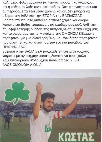 Καλημέρα φίλοι μου. Όσοι με ξέρουν προσωπικά, γνωρίζουν ότι η κάθε μου λέξη είναι από καρδιάς. Όση απογοήτευση και αν περάσαμε τα τελευταία χρόνια, κανείς δεν μπορεί να σβήσει την ιδέα, την ιστορία της «Βασίλισσας» μας. Πρωταθλήματα, κύπελλα, ασπίδες, χαρές και ακόμα λύπες, είναι βαθιά τυπωμένα στις καρδιές μας. Μαζί λαέ της δημοφιλέστερης ομάδας της Κύπρου, δώσαμε την ψυχή μας και το σώμα μας για το μεγαλείο της Ομόνοιας. Είμαστε περήφανοι για μια ολόκληρη ζωή, και εγώ διπλά περήφανος που αγαπήθηκα και αγάπησα τον έναν και μοναδικό, πράσινο λαό. Εύχομαι στη «Βασίλισσα» μας, κάθε επιτυχία φέτος, σας χαιρετώ με αγάπη, μην μασάτε, δυνατοί να είστε. Καλό Σαββατοκύριακο σε όλους και πάνω απ’ όλα υγεία. Λαός Ομόνοια αιώνια».