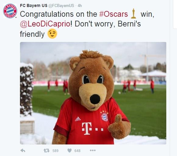 Ο αμερικανικός λογαριασμός twitter των "Βαυαρών", έδωσε συγχαρητήρια στον Ντι Κάπριο με μία φωτογραφία της μασκότ της ομάδας. Το θέμα είναι πως η μασκότ της Μπάγερν είναι μια αρκούδα, όμως "ο Μπέρνι είναι φιλικός", άρα δεν χρειάζεται να ανησυχεί ο Αμερικανός θριαμβευτής των 88ων βραβείων Όσκαρ.