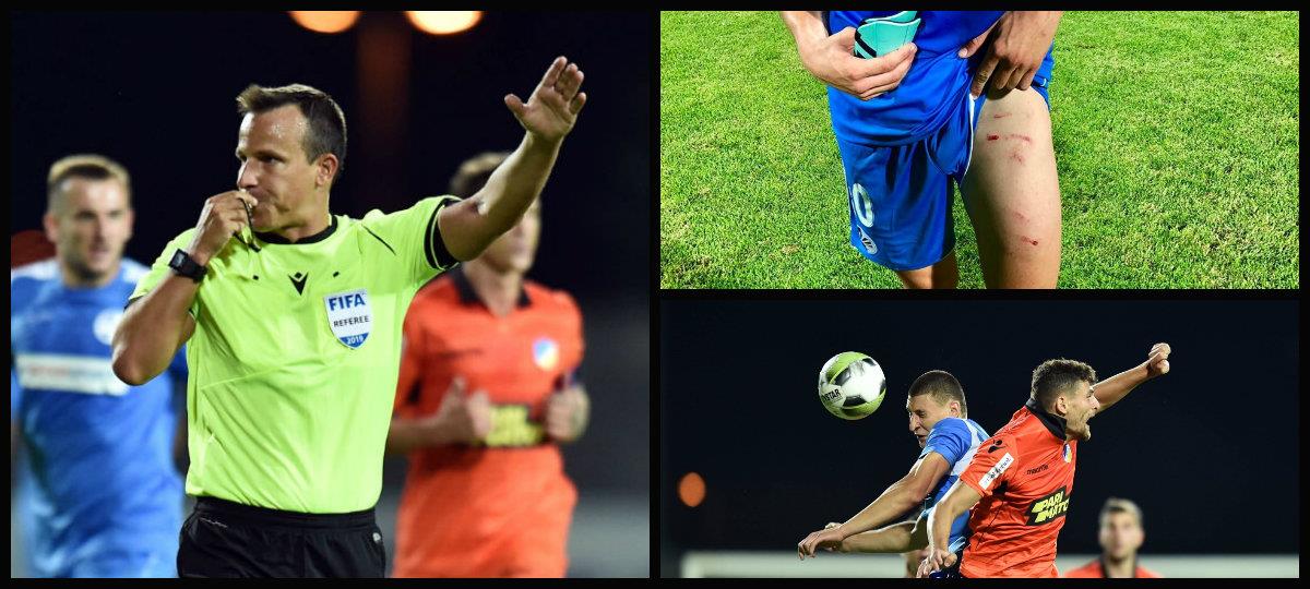 Στη φάση που ο διαιτητής Ίστβαν Βαντ υπεδείκνυε το πέναλτι στον ΑΠΟΕΛ στο 42’, σε πέσιμο του Μούσα Αλ Τάμαρι, στην περιοχή, οι παίκτες της Σουτιέσκα έπεσαν πάνω στον Ούγγρο διαιτητή.