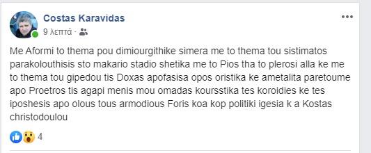 Με αφορμή το θέμα που δημιουργήθηκε σε σχέση με το σύστημα παρακολούθησης στο Μακάρειο στάδιο, ο Κώστας Καραβίδας, μη ανεχόμενος την κοροϊδία, όπως χαρακτηριστικά ανέφερε, υπέβαλε την παραίτηση του, τονίζοντας πως είναι οριστική και αμετάκλητη.