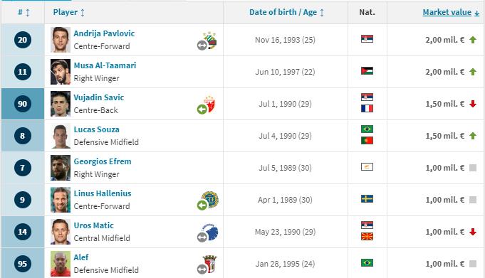 Τη μεγαλύτερη χρηματιστηριακή αξία στο έμψυχο δυναμικό των γαλαζοκιτρίνων έχουν οι Μούσα Αλ Τάμαρι και Αντρίγια Πάβλοβιτς με 2.000.000 ευρώ. Στη δεύτερη θέση ισοβαθμούν οι Βουγιαντίν Σάβιτς και Λούκας Σόουζα με 1.500.000 ευρώ.