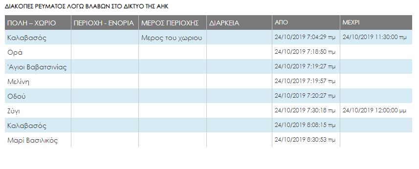 Στη Λευκωσία, παρατηρείται βλάβη σε δύο περιοχές, στη Λεμεσό παρατηρούνται βλάβες σε οκτώ και στη Λάρνακα σε άλλες οκτώ περιοχές. Στην Πάφο, εννέα περιοχές δεν έχουν ρεύμα, ενώ στην ελεύθερη Αμμόχωστο δεν σημειώθηκαν βλάβες.
