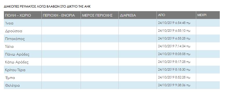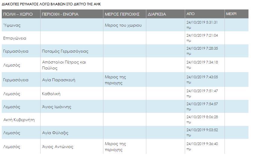 Στη Λευκωσία, παρατηρείται βλάβη σε δύο περιοχές, στη Λεμεσό παρατηρούνται βλάβες σε οκτώ περιοχές και στη Λάρνακα σε άλλες οκτώ περιοχές. Στην Πάφο, εννέα περιοχές δεν έχουν ρεύμα, ενώ στην ελεύθερη Αμμόχωστο δεν υπάρχουν βλάβες.