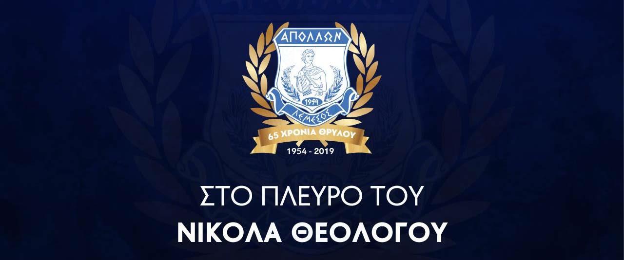 Η Εταιρεία Απόλλων Ποδόσφαιρο (Δημόσια) Λτδ, σε συνέχεια της ανακοίνωσης της Τετάρτης (27/9) αναφορικά με την στήριξη στον Νικόλα Θεολόγου, ενημερώνει το φίλαθλο κοινό ότι πριν από τον αγώνα της Κυριακής (1/12) με αντίπαλο τη Νέα Σαλαμίνα στο Τσίρειο στάδιο θα πραγματοποιηθεί έρανος έτσι ώστε να βοηθηθεί ο 19χρονος και να καταφέρει να ταξιδέψει στις ΗΠΑ για να μεταβεί σε ειδικευμένο κέντρο.