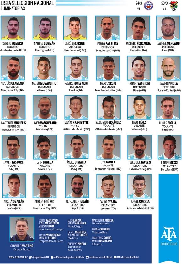 Ο ομοσπονδιακός τεχνικός της Αργεντινής, Χεράρδο Μαρτίνο, ανακοίνωσε την αποστολή για τις αναμετρήσεις με Χιλή και Βολιβία στα τέλη Μαρτίου για τα προκριματικά του Μουντιάλ 2018.