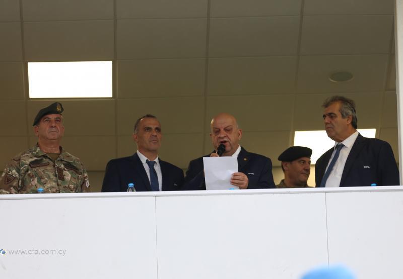 Ο Πρόεδρος της ΚΟΠ Γιώργος Κούμας απηύθυνε χαιρετισμό πριν την έναρξη του τελικού του Στρατιωτικού Πρωταθλήματος, ο οποίος διεξάγεται τώρα στο ΑΕΚ Αρένα μεταξύ 3ης ΤΑΞΥΠ και της 6ης Μ/ΚΤΑΞ ΠΖ.