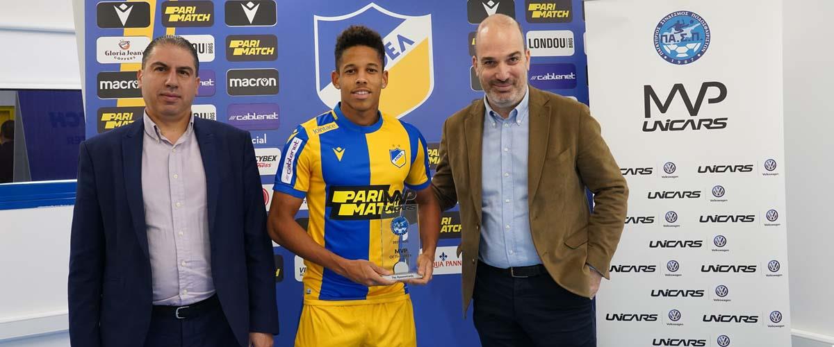 Το βραβείο παρέδωσαν στον ποδοσφαιριστή εκ μέρους της χορηγού εταιρείας Unicars (Volkswagen), ο κ. Κωνσταντίνος Ανανιάδης, Marketing Manager και ο κ. Σάββας Παύλου, Sales Manager Λευκωσίας.