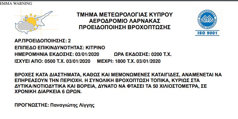 Λόγω των έντονων καιρικών φαινομένων που πλήττουν την Κύπρο, η Μετεωρολογική Υπηρεσία εξέδωσε εκ νέου κίτρινη προειδοποίηση, η οποία βρίσκεται σε ισχύ από τις 5:00 το πρωί μέχρι τις 6:00 το απόγευμα.