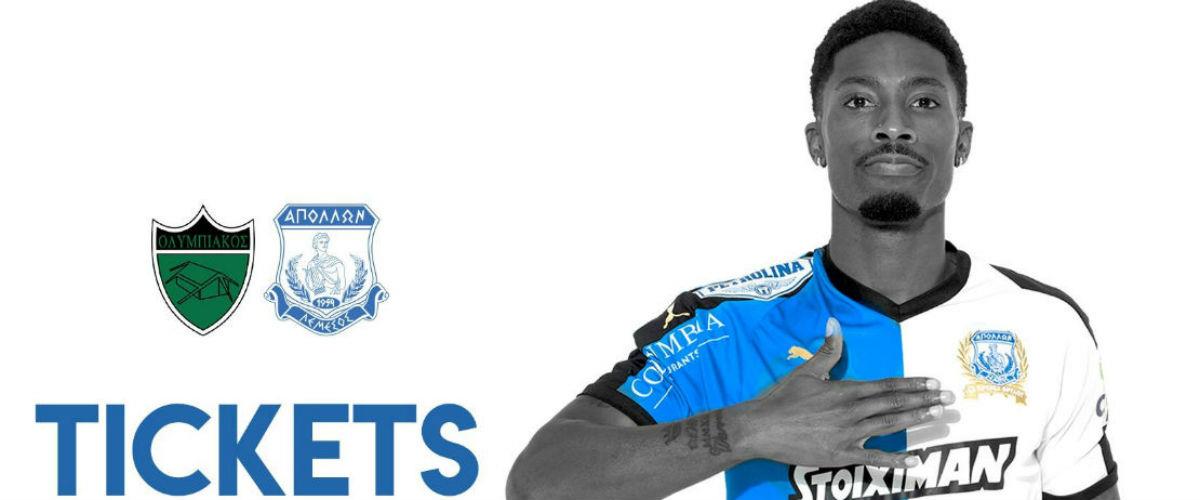 Η Εταιρεία Απόλλων Ποδόσφαιρο (Δημόσια) Λτδ ενημερώνει ότι το πρωί της Πέμπτης (09/01, 10:00), αρχίζει η προπώληση των εισιτηρίων για τον εκτός έδρας αγώνα της 16ης αγωνιστικής του πρωταθλήματος CYTA, με τον Ολυμπιακό Λευκωσίας (Κυριακή, 12/01, 18:00) στο Μακάρειο Στάδιο στην Λευκωσία.