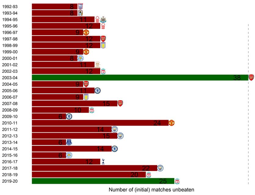 Η κορυφαία επίδοση ανήκει, φυσικά, στο αήττητο πρωτάθλημα της Άρσεναλ την περίοδο 2003/04.