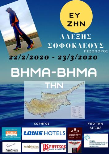 Το Σάββατο 22 Φεβρουαρίου 2020 και ώρα 9.30 π.μ., στο παραλιακό μέτωπο Ορόκλινης (δίπλα από το ξενοδοχείο Lebay) ξεκινά για πρώτη φόρα, ένα ταξίδι 700 χιλιομέτρων για να καλύψει όλη την Κύπρο περιμετρικά με τα πόδια.