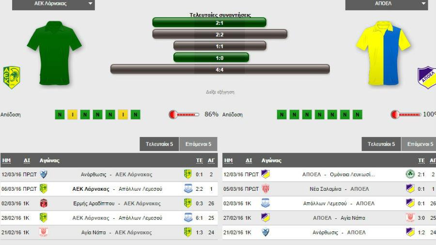 Ο ΑΠΟΕΛ προέρχεται από 11 συνεχόμενες νίκες, ενώ η ΑΕΚ στο αντίστοιχο διάστημα μετρά επτά νίκες, δύο ήττες και δύο ισοπαλίες, με αποτέλεσμα την ανατροπή της βαθμολογίας και τη δημιουργία μικρής διαφοράς υπέρ του ΑΠΟΕΛ. Η ομάδα της Λευκωσίας έχει απολογισμό 22 νίκες, δύο ισοπαλίες και τέσσερις ήττες. Οι κιτρινοπράσινοι έχουν τις λιγότερες ήττες (3), όμως έχουν πέντε ισοπαλίες. Τα νικηφόρα αποτελέσματά τους είναι 20.