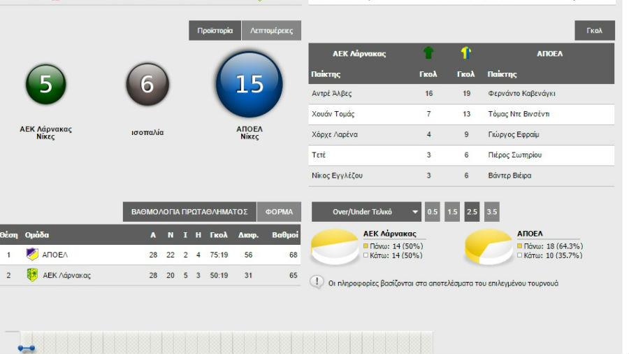 Στα παιχνίδια της ΑΕΚ υπάρχει μια ισορροπία σχετικά με τα under και τα over της, αφού στα προηγούμενα, τα μισά έληξαν με το σκορ στο under και τα υπόλοιπα στο over. Όπως είναι αντιληπτό, ο ΑΠΟΕΛ μετρά περισσότερα over και συγκεκριμένα 18, δηλαδή ποσοστό 64,3%).
